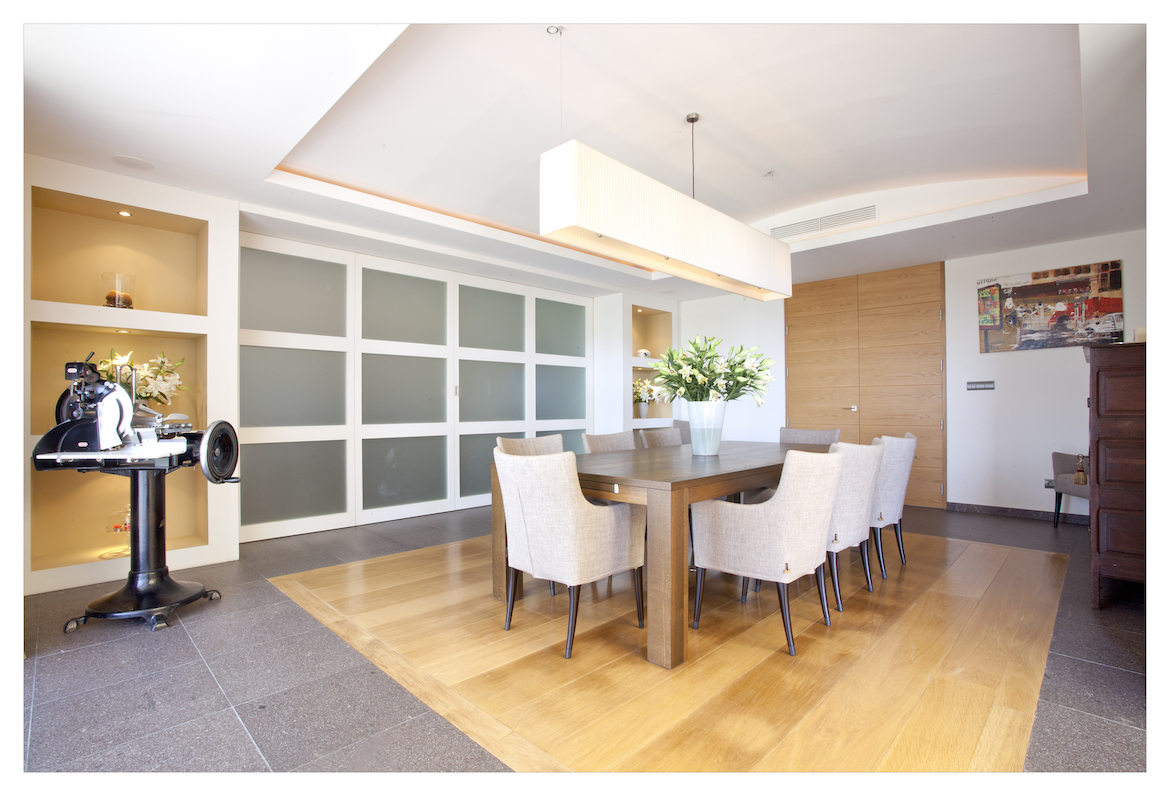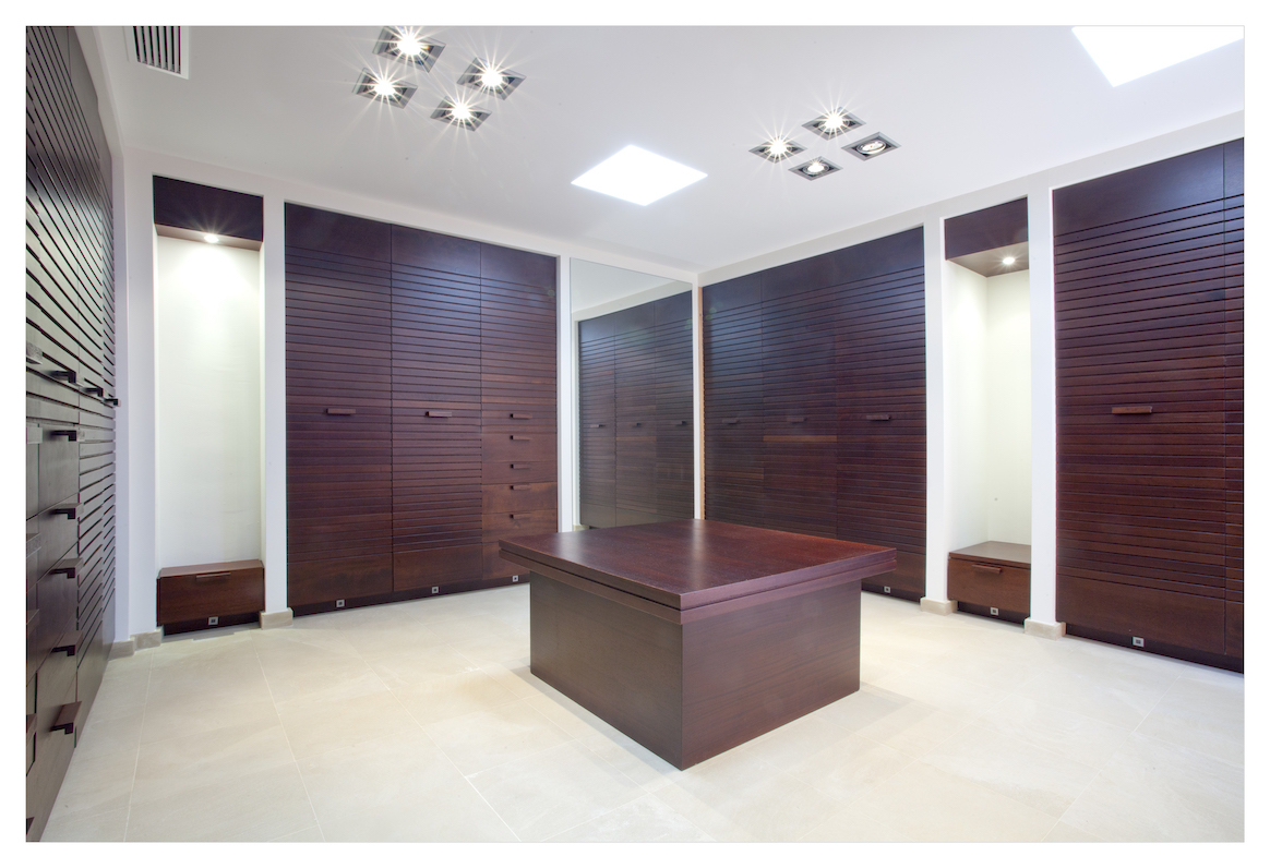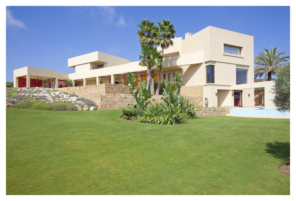 The architecture harmoniously blends modern lines with traditional craftsmanship, featuring hand-crafted Corian bricks, elegant serpeggiante marble flooring, and rich iroko wood parquet in the bedrooms — creating an ambiance of understated sophistication throughout.