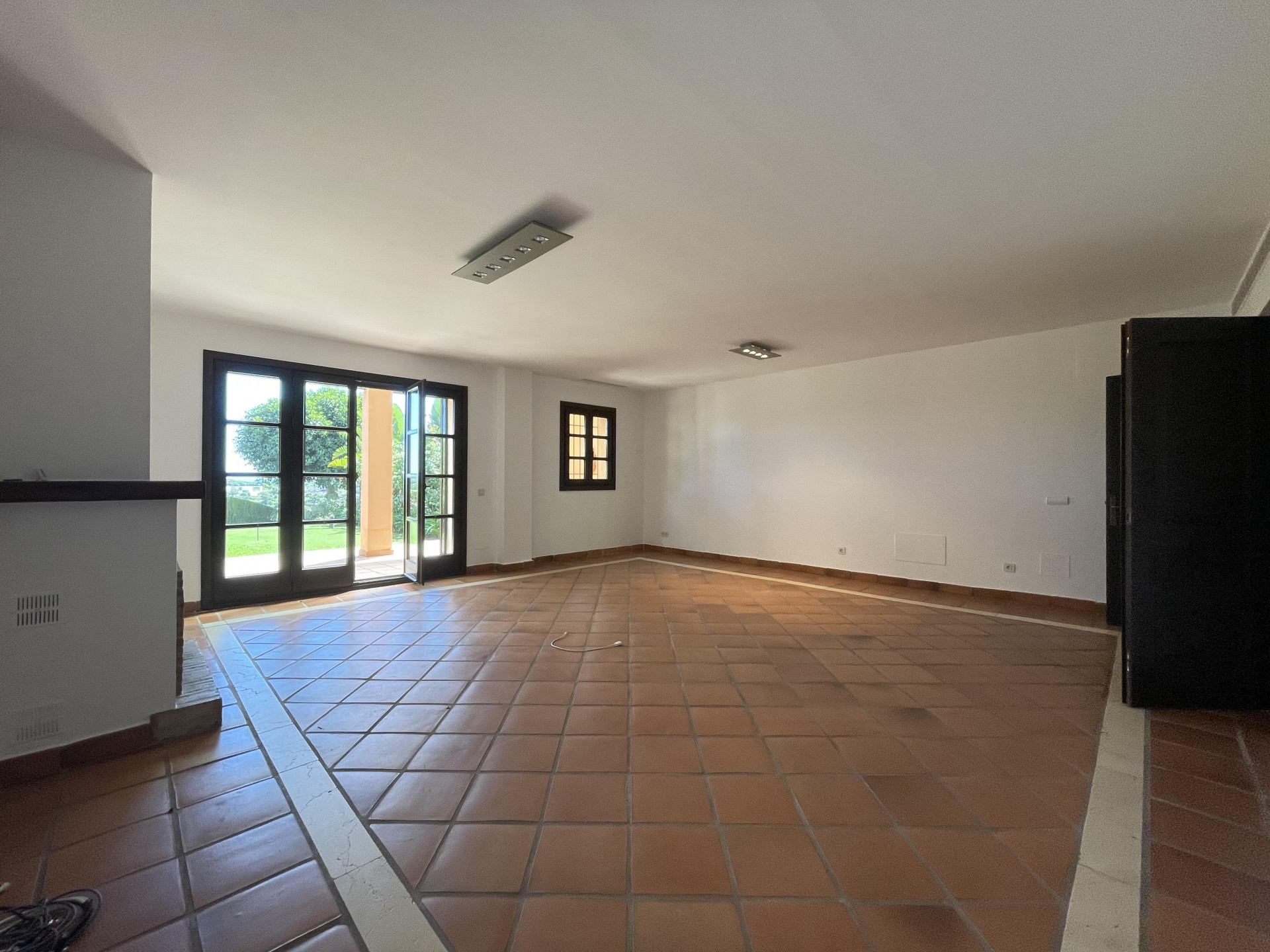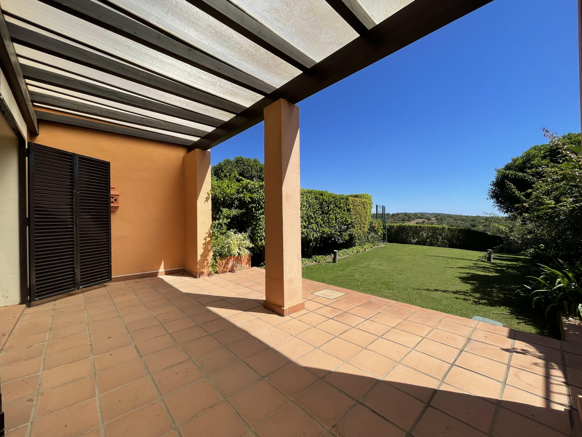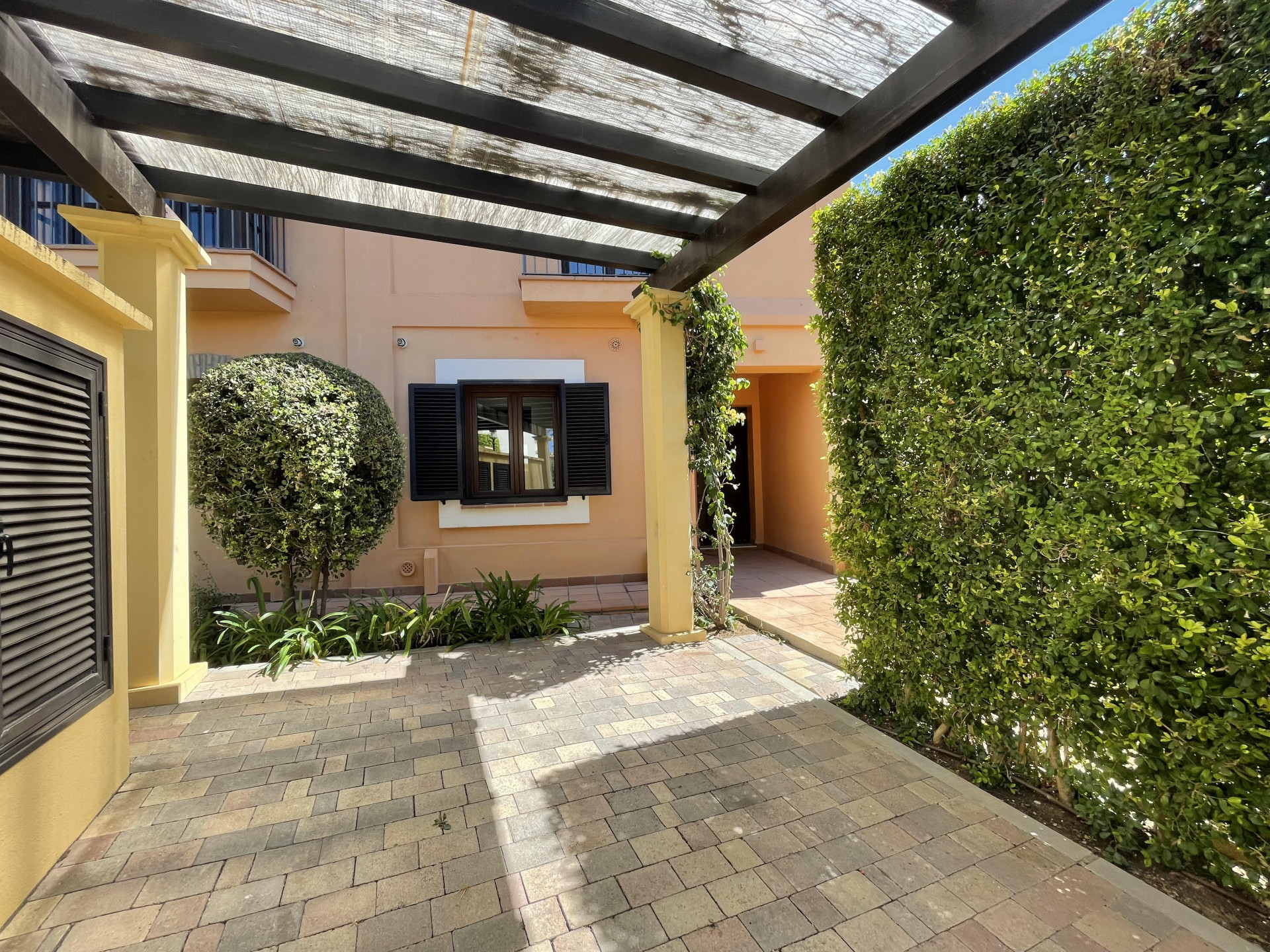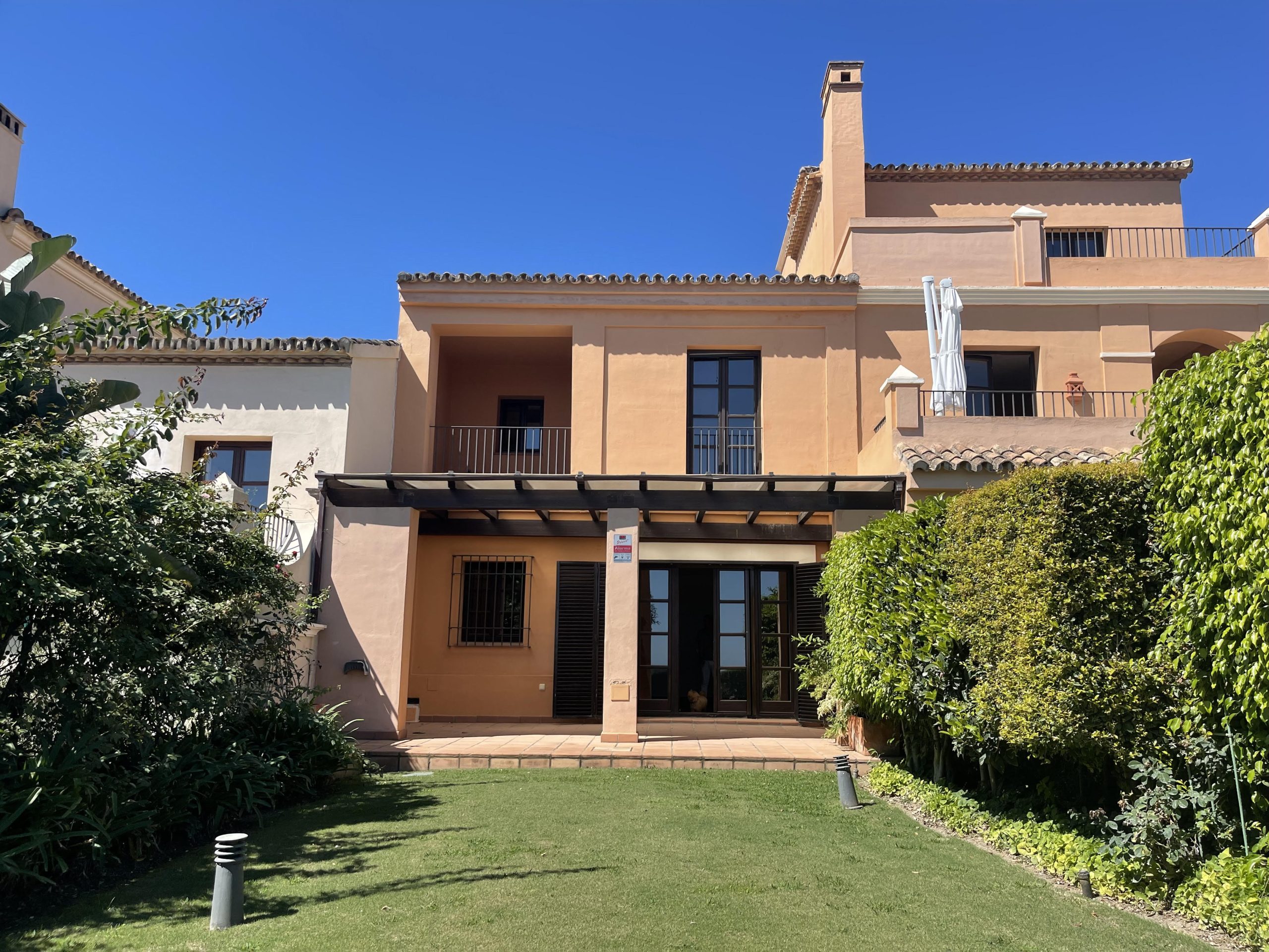This traditional Andalusian-style Townhouse is located in Los Cortijos de la Reserva, Sotogrande. It consists of two spacious bedrooms with many build-in wardrobes and their own bathroom ensuite, a modern fitted kitchen with a separate utility room, an open living and dining area with an open fireplace, and a guest toilet. The living and dining room is leading to a spacious covered terrace and a private garden with stunning views of the landscape and the Mediterranean sea. The garden is maintenance by the community. Underfloor heating throughout and air conditioning.